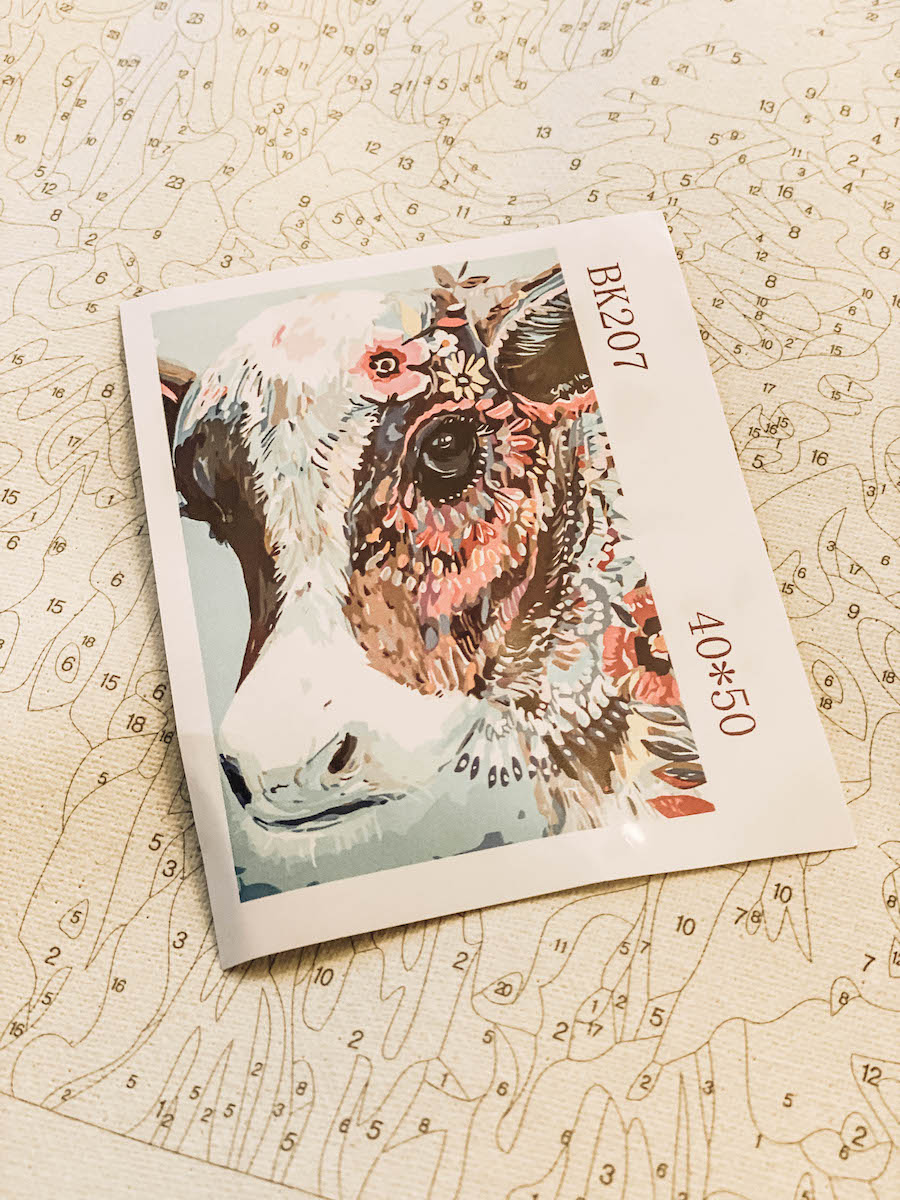 The first recommended adult paint by numbers kit is the one that I completed myself—this colorful cow! The entire process took about fifteen hours and two weeks to finish. Though it wasn’t necessarily hard to complete, seeing all the tiny numbers was tricky. In the end, my masterpiece turned out looking pretty close to the original.